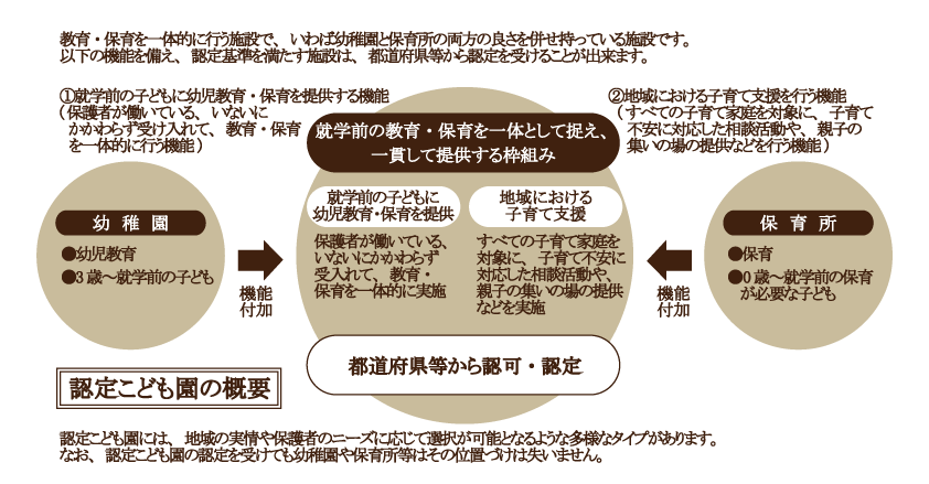 教育・保育を一体的に行う施設で、いわば幼稚園と保育所の両方の良さを併せ持っている施設です。認定こども園には、地域の実情や保護者のニーズに応じて選択が可能です。認定こども園の認定を受けても幼稚園はその位置づけは失いません。